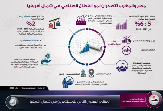 نشر مركز معلومات مجلس الوزراء، إنفوجراف سلط من خلاله الضوء على توقعات مؤسسة رينيسانس كابيتال نمو الناتج الصناعى فى شمال إفريقيا بقيادة مصر والمغرب، كما توقعت أن تسهم الإصلاحات الاقتصادية فى مصر والمغرب فى تخفيف التحديات التى تواجهها المنطقة